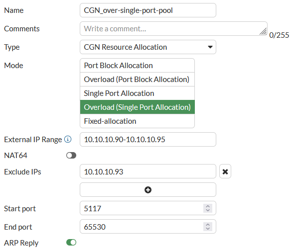 nat64). Enable to make this a NAT64 IP pool. - ARP reply (