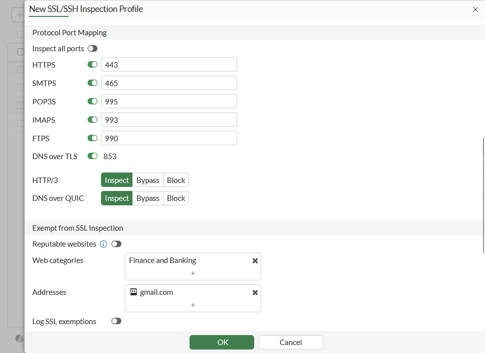 HTTPS and DOT options can enable QUIC inspection using the set quic inspect command. See DNS over QUIC and DNS over HTTP3 for transparent and local-in DNS modes for more information.