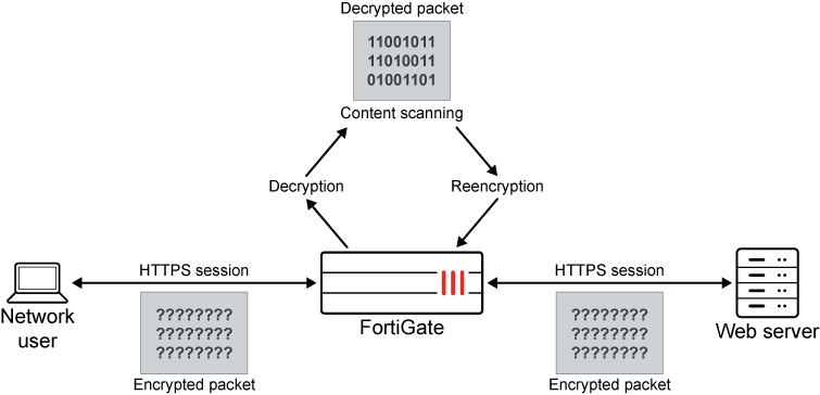 When you use deep inspection, the FortiGate impersonates the recipient of the originating SSL session, then decrypts and inspects the content to find threats and block them. It then re-encrypts the content and sends it to the real recipient.