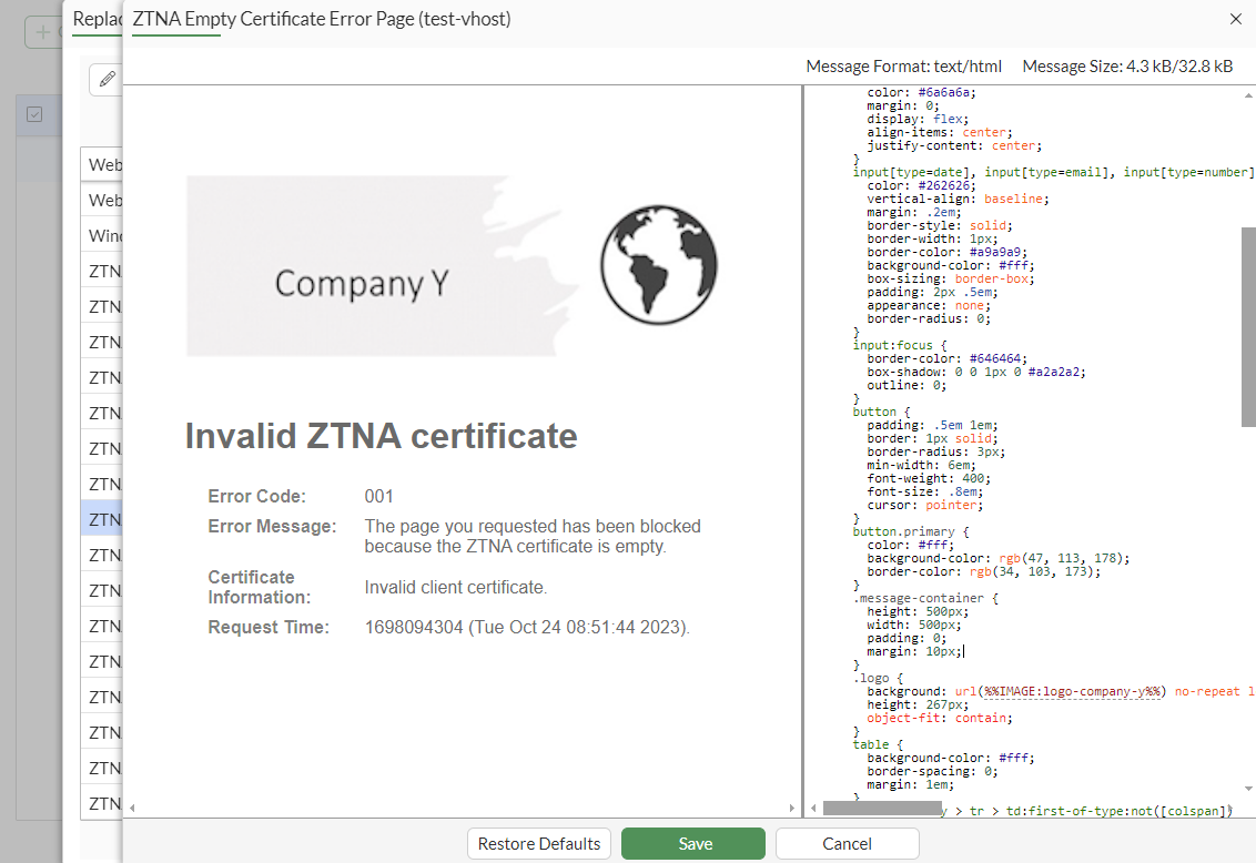 In this example, a ZTNA virtual host named server1.ztna.local is mapped to a replacement message group named test-vhost, and the group includes a customized ZTNA Empty Certificate Error Page message. The message is customized with a Company Y logo.