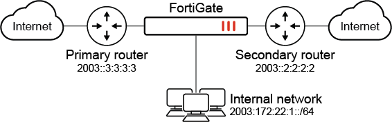 In this example, the FortiGate uses NAT64 where the LAN via Router1 uses IPv6 and where Router2 is the internet gateway using IPv4.
