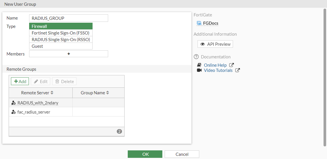 - Configure two firewall groups, one named radius_group with remote server member fac_radius_server, and one named radius_group_2 with remote server member RADIUS_with_2ndary (refer to the previous example).