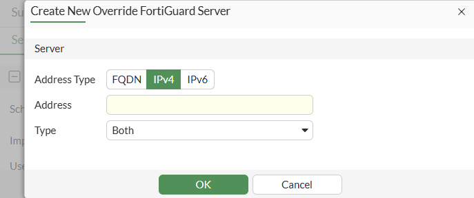 In the Override FortiGuard servers table, click Create New. The Create New Override FortiGuard Server pane opens.