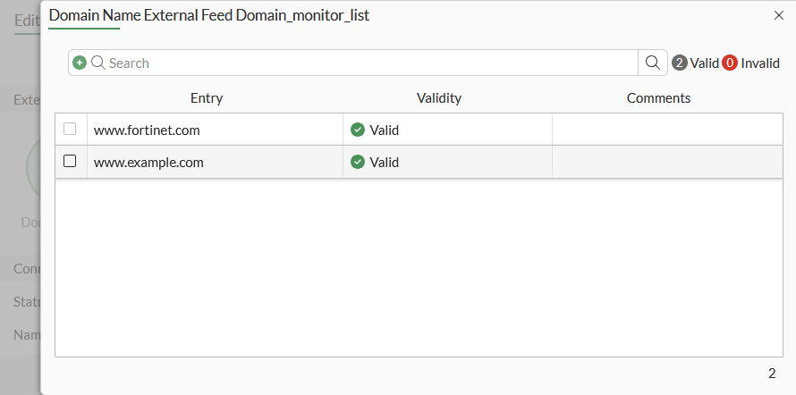 Edit the connector, then click View Entries to view the domain names in the feed (fortinet.com and example.com).