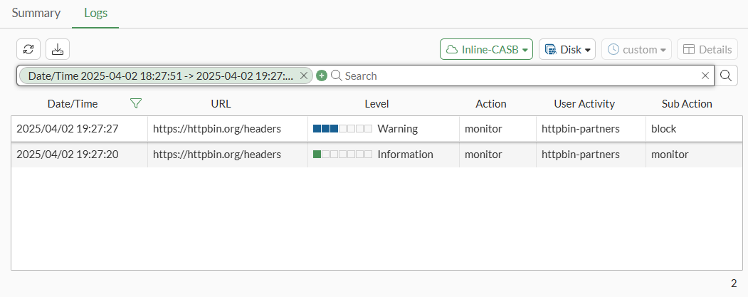 1: date=2025-03-22 time=00:25:19 eventtime=1742628319441656177 tz="-0700" logid="2500010002" type="utm" subtype="casb" eventtype="casb" level="information" vd="vdom1" policyid=1 poluuid="e0a45778-05e0-51f0-d77d-e4e8a02811e2" policytype="policy" sessionid=7535 srcip=10.1.100.13 dstip=54.236.151.211 srcport=46476 dstport=443 srcintf="lan" srcintfrole="undefined" srcuuid="bcbee936-05e0-51f0-5712-f0e95616dde0" dstintf="mgmt" dstintfrole="lan" dstuuid="bcbee936-05e0-51f0-5712-f0e95616dde0" proto=6 url="https://httpbin.org/headers" action="monitor" profile="casbProfile" saasapp="httpbin" useractivity="httpbin-partners" subaction="monitor" tenantmatch="matched" activitycategory="other" msg="CASB access was monitored because it contained activity."