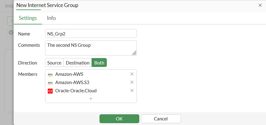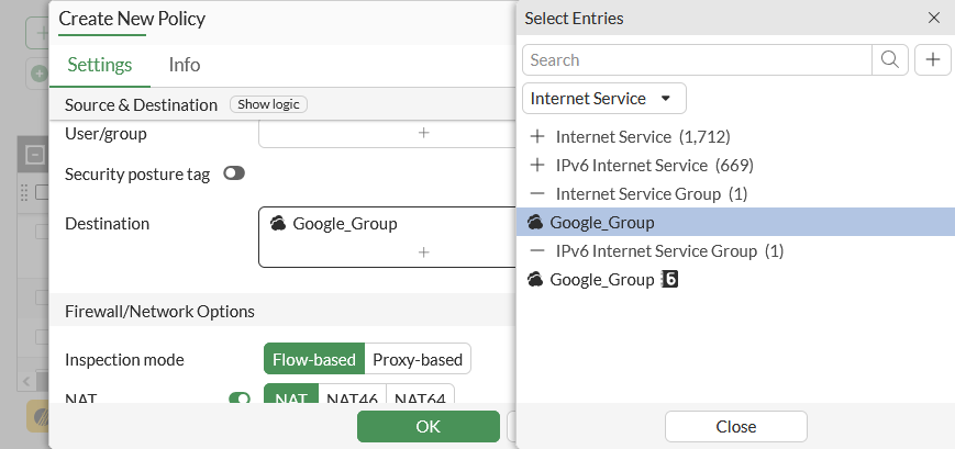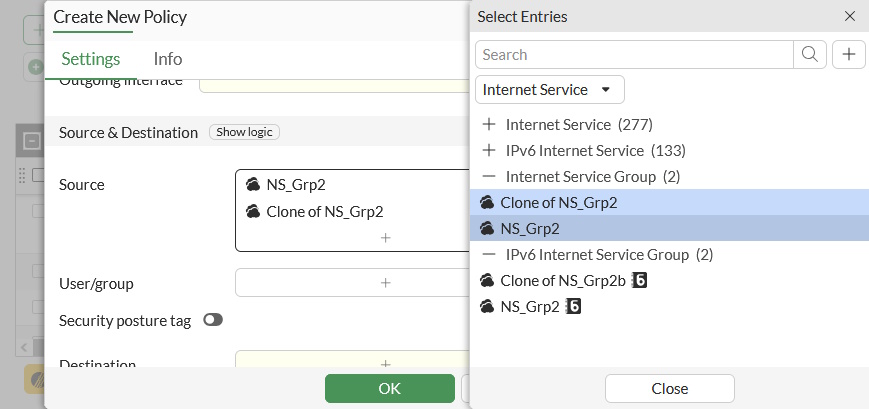 Select Internet Service, and select one or more internet service groups, such as NS_Grp2.