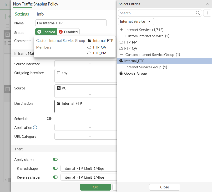 config firewall shaping-policy edit 1 set name "For Internal FTP" set internet-service enable set internet-service-custom-group "Internal_FTP" set dstintf "port1" set traffic-shaper "Internal_FTP_Limit_1Mbps" set traffic-shaper-reverse "Internal_FTP_Limit_1Mbps" set srcaddr "PC" next end
