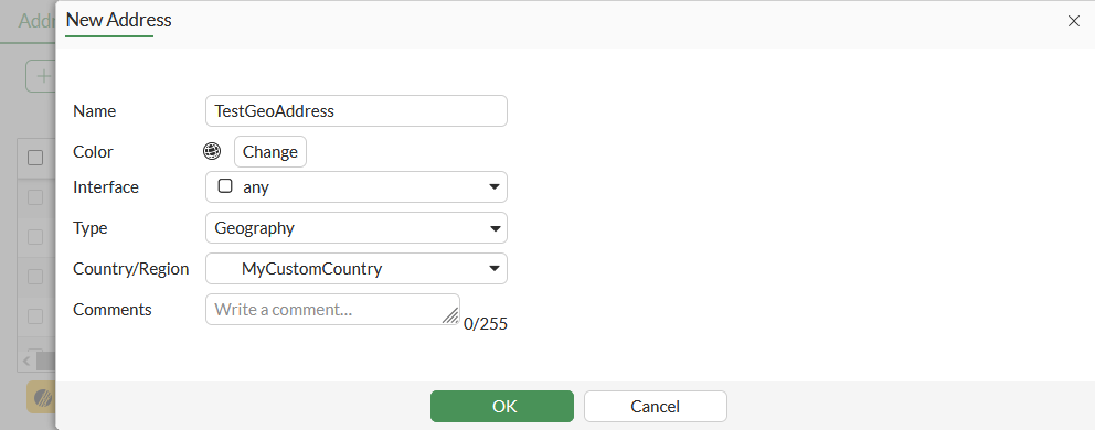 FGT # 0: config firewall address 0: edit "TestGeoAddress" 0: set type geography 0: set country "A0" 0: end