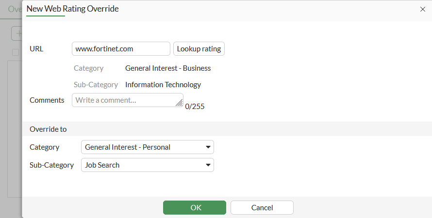 See Example 1: Override a FortiGuard category with another FortiGuard category for a sample configuration.
