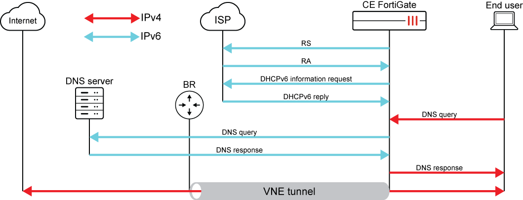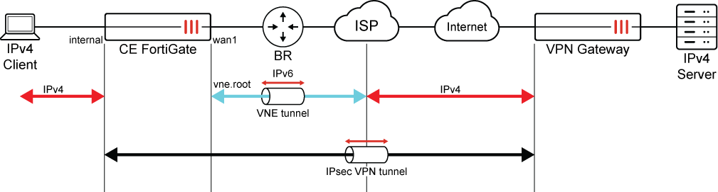 Once the VNE tunnel is established, an IPv4-over-IPv6 tunnel is set up between the FortiGate and BR. The route, firewall policy, and DNS server can now be configured to let the traffic go through the VNE tunnel and protect the end-user. The VNE tunnel can also be used in IPsec phase 1.