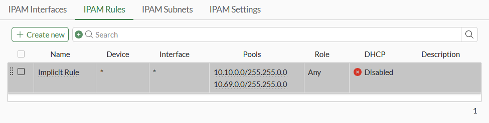 Once subnets are added, they are automatically included in the implicit IPAM rule called Implicit Rule. This rule encompasses all subnets with the role set to ANY and DHCP disabled. The Implicit Rule cannot be edited or deleted.
