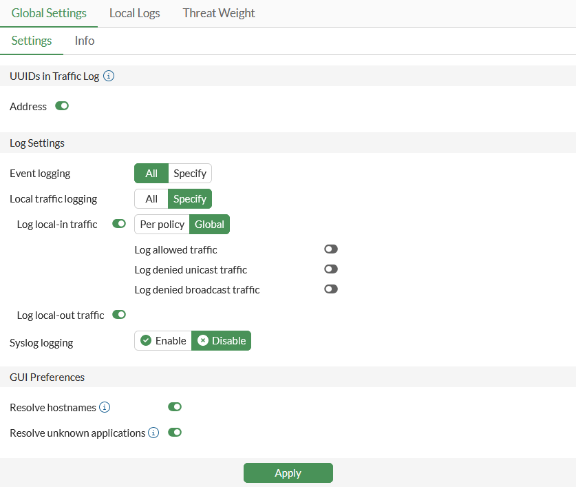 If per policy local-in traffic logging is enabled, the allowed traffic, denied unicast traffic, and denied broadcast traffic logging does not need to be configured for the log settings. When traffic logging is enabled for the local-in policy, the denied unicast traffic and denied broadcast traffic logs will be included.