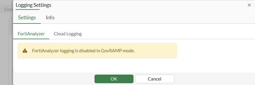 In the following example, the user attempts to enable FortiAnalyzer on a GovRamp FortiGate which is an unsupported service on GovRamp devices.