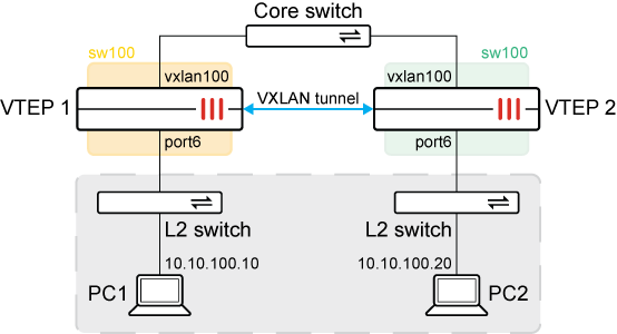 In this example, two FortiGates are configured as VXLAN tunnel endpoints (VTEPs). A VXLAN is configured to allow L2 connectivity between the networks behind each FortiGate. The VXLAN interface and port6 are placed on the same L2 network using a software switch (sw100). An L2 network is formed between PC1 and PC2.
