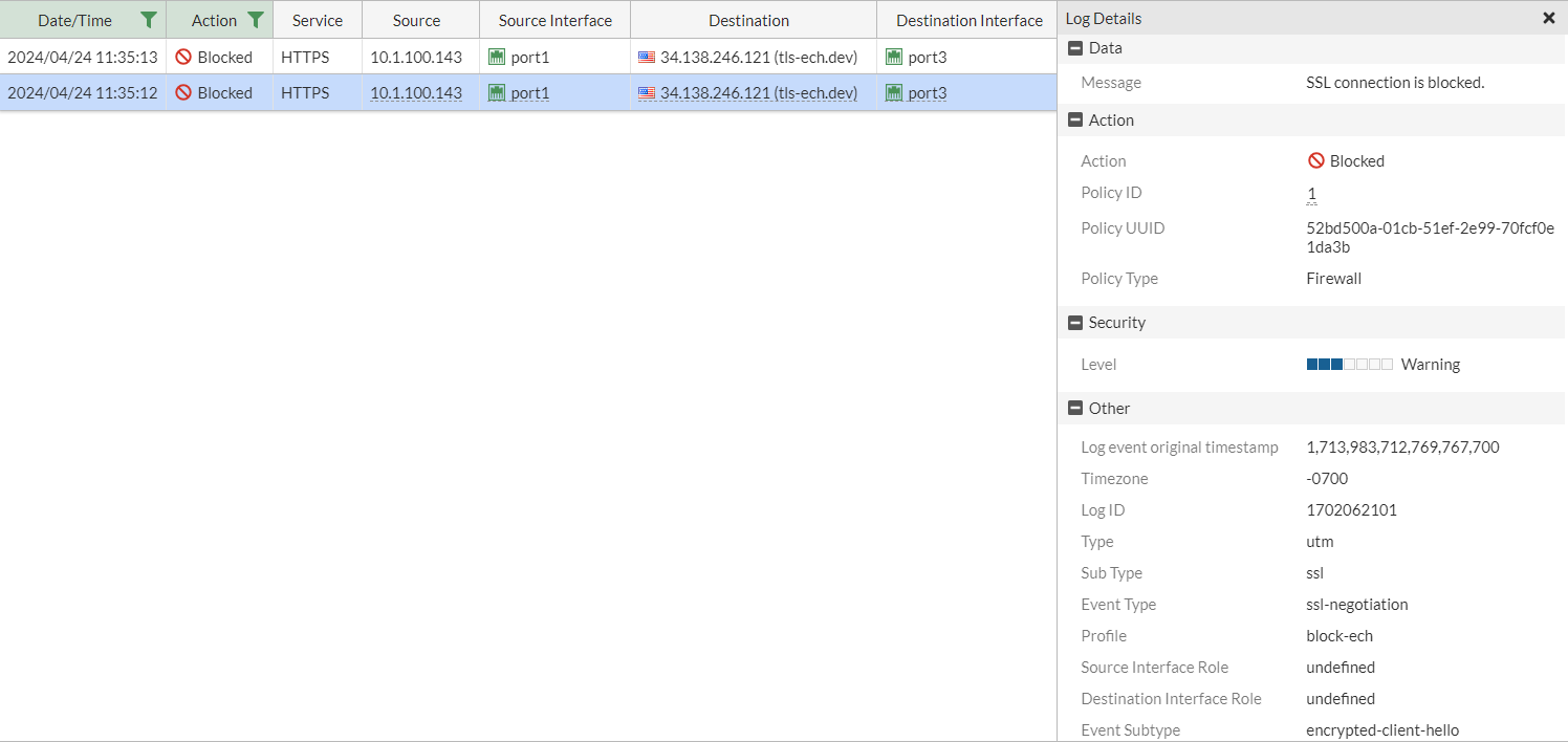 2: date=2024-04-24 time=11:35:12 eventtime=1713983712769767807 tz="-0700" logid="1702062101" type="utm" subtype="ssl" eventtype="ssl-negotiation" level="warning" vd="vdom1" action="blocked" policyid=1 poluuid="52bd500a-01cb-51ef-2e99-70fcf0e1da3b" policytype="policy" sessionid=120849 service="HTTPS" profile="block-ech" srcip=10.1.100.143 srcport=63253 srccountry="Reserved" dstip=34.138.246.121 dstport=443 dstcountry="United States" srcintf="port1" srcintfrole="undefined" dstintf="port3" dstintfrole="undefined" srcuuid="fbd0def6-01ca-51ef-496f-08c90cb6b123" dstuuid="fbd0def6-01ca-51ef-496f-08c90cb6b123" proto=6 eventsubtype="encrypted-client-hello" hostname="public.tls-ech.dev" msg="SSL connection is blocked."