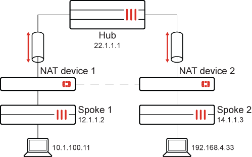 In the following example, device 10.1.100.11 behind Spoke1 needs to reach device 192.168.4.33 behind Spoke2. Spoke1 and Spoke2 are behind NAT devices and have established IPsec tunnels to the Hub. The hole punching creates a shortcut between Spoke1 and Spoke2 that bypasses the Hub.