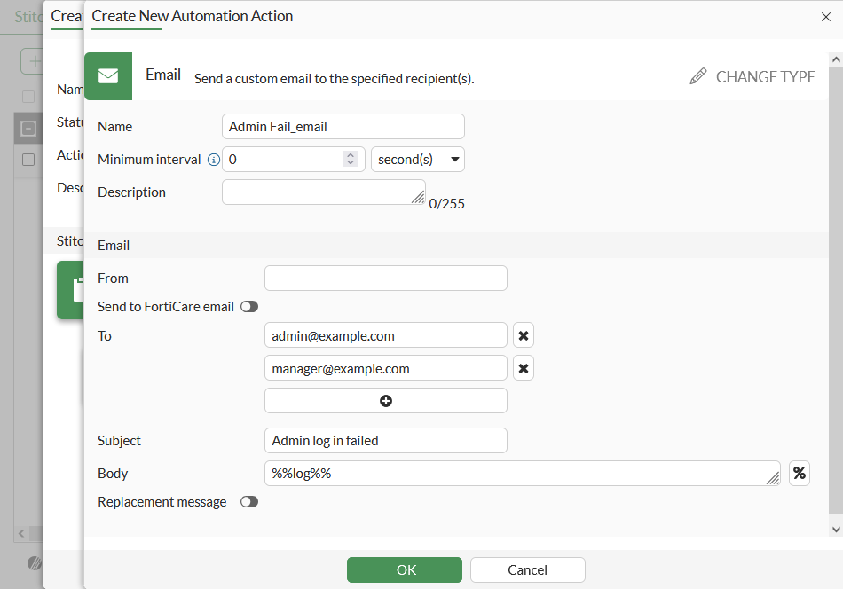 config system automation-action edit "Admin Fail_email" set action-type email set email-to "admin@example.com" "manager@example.com" set email-subject "Admin log in failed" next edit "Config Change_email" set action-type email set email-to "admin@example.com" "manager@example.com" set email-subject "Configuration Change Detected" next end -