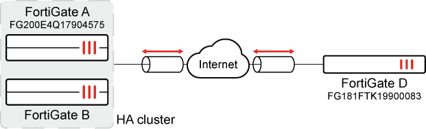In this example, FortiGates A and B are in an HA cluster, so the serial numbers will not exchange after failover. The cluster is connected to FortiGate D through IPsec VPN.
