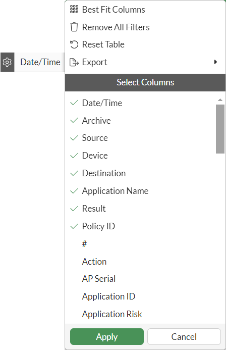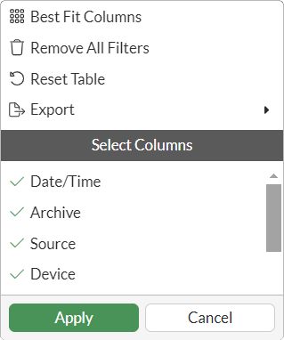 Filters are used to locate a specific set of information or content in a table. They can be particularly useful for locating specific log entries. The filtering options vary, depending on the type of information in the table.