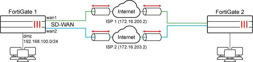 For example, a customer has two ISP connections, wan1 and wan2. On each FortiGate, two IPsec VPN interfaces are created. Next, an ipsec-aggregate interface is created and added as an SD-WAN member.