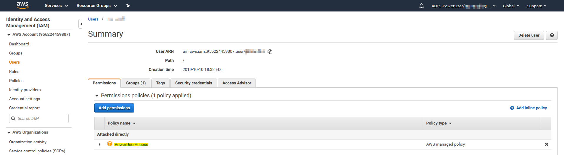FGT # awsd sdn connector AWS_SDN prepare to update awsd sdn connector AWS_SDN start updating aws curl response err, 403 <?xml version="1.0" encoding="UTF-8"?> <Response><Errors><Error><Code>UnauthorizedOperation</Code><Message>You are not authorized to perform this operation.</Message></Error></Errors><RequestID>8403cc11-b185-41da-ad6d-23bb4db7d00a</RequestID></Response> awsd curl failed 403 awsd sdn connector AWS_SDN failed to get instance list aws curl response err, 403 {"Message":"User: arn:aws:iam::956224459807:user/jcarcavallo is not authorized to perform: eks:ListClusters on resource: arn:aws:eks:us-east-1:956224459807:cluster/*"} awsd sdn connector AWS_SDN get EKS cluster list failed awsd sdn connector AWS_SDN list EKS cluster failed awsd sdn connector AWS_SDN start updating IP addresses awsd sdn connector AWS_SDN finish updating IP addresses awsd reap child pid: 569In this case, you must configure power user access for the current administrator in the AWS management console: