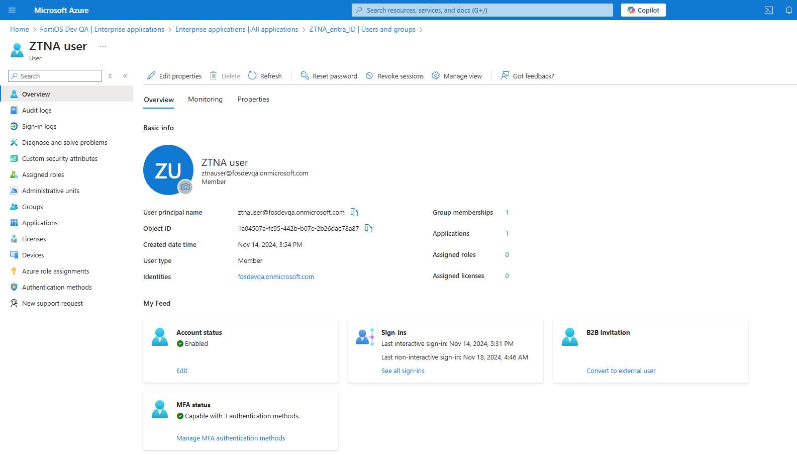 Users and groups can be assigned to the enterprise application. In this example, the user ztnauser@fosdevqa.onmicrosoft.com belongs to a group assigned to the ZTNA_entra_ID app.