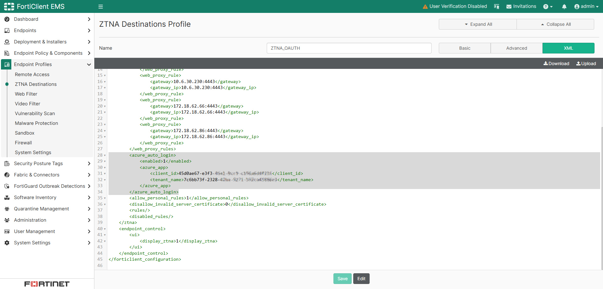 <forticlient_configuration> <ztna> … <azure_auto_login> <enabled>1</enabled> <azure_app> <client_id>45d0ae67-e3f3-xxxx-xxxx-xxxxxxxxxxxx</client_id> <tenant_name>7c6bb73f-2328-xxxx-xxxx-xxxxxxxxxxxx</tenant_name> </azure_app> </azure_auto_login> … </ztna> <forticlient_configuration>