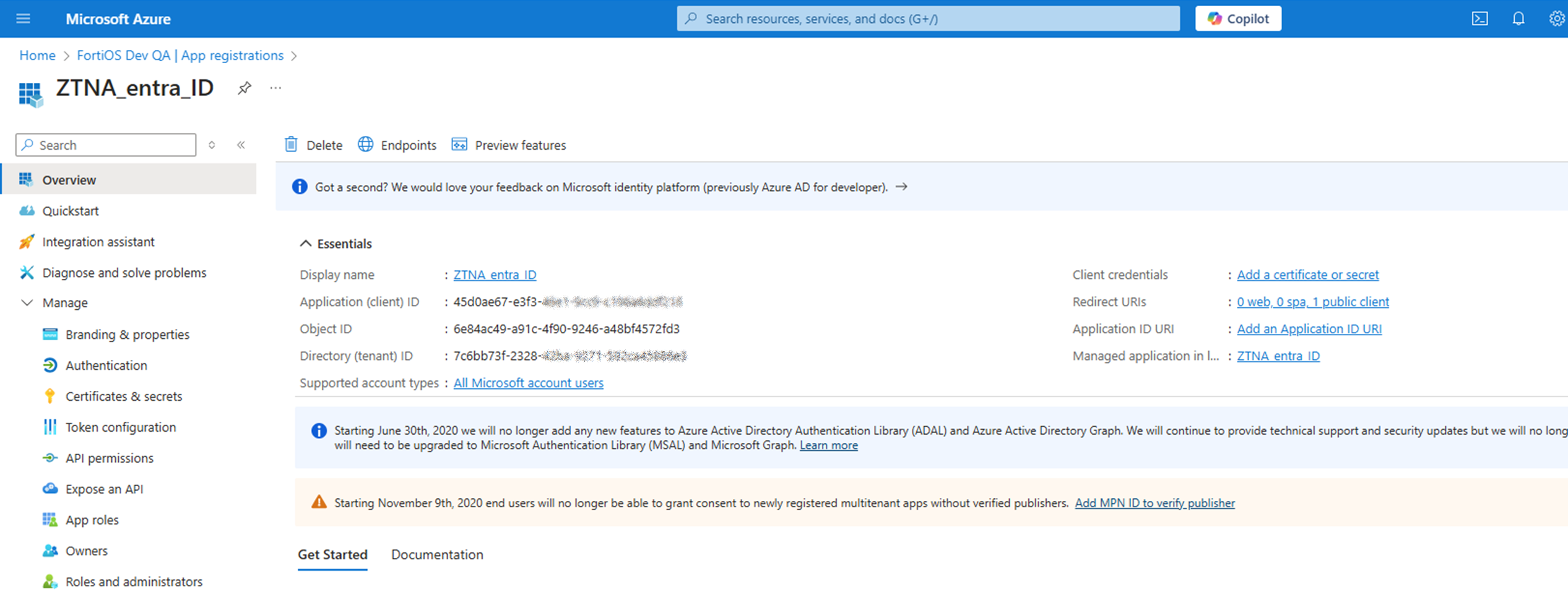 In the this example, the values from the ZTNA_entra_ID app can be applied to the FortiClient EMS ZTNA Destinations profile in later steps: