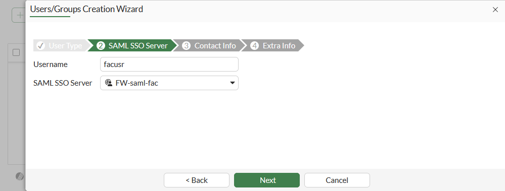 4. Enter a Username and select a SAML SSO Server, then click Next.