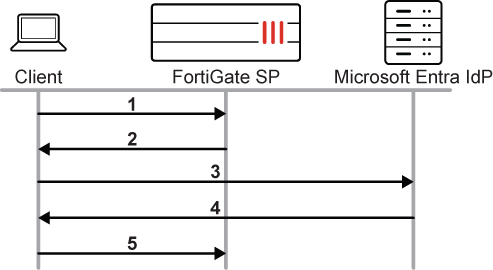 A FortiGate (SP) can provide a web service, such as an Agentless VPN connection, that requires users to be authenticated through SAML. The user identities for the company can be stored remotely in an IdP, such as Microsoft Entra ID. Other applications might also require authentication from the same IdP, so after a user is authenticated once, the same SAML assertion carrying user and group information can be used to authorize the user access to the FortiGate Agentless VPN, as well as other applications.