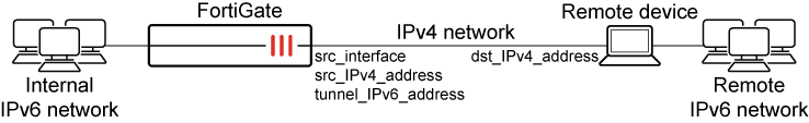 The following tunnel configuration tunnels IPv6 traffic over an IPv4 network. An internal IPv6 interface can be configured under config system interface.