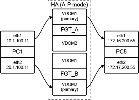 In this example, FGT_A and FGT_B are in HA a-p mode with two virtual clusters. Two primaries exist on different FortiGate units. PC1 eth1 can access PC5 eth1 through VDOM1, and PC1 eth2 can access PC5 eth2 through VDOM2.