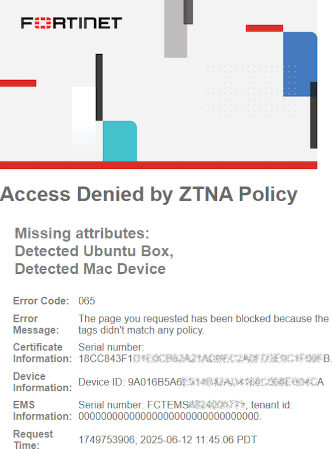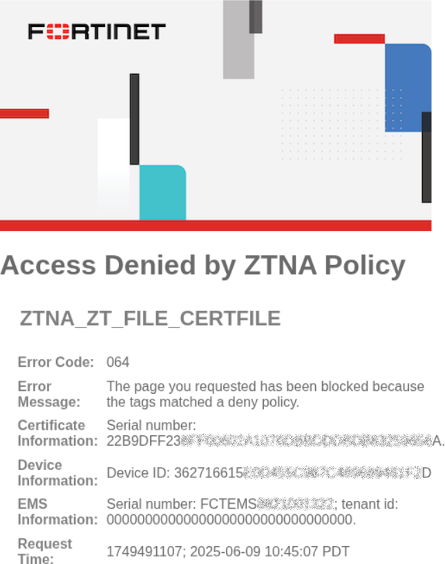 For example, if a FortiGate is configured with a deny policy when matching a specific security posture tag called ZTNA_ZT_FILE_CERTFILE, and the endpoint client hit the deny policy because it matched this tag, an access denied message is would be shown.