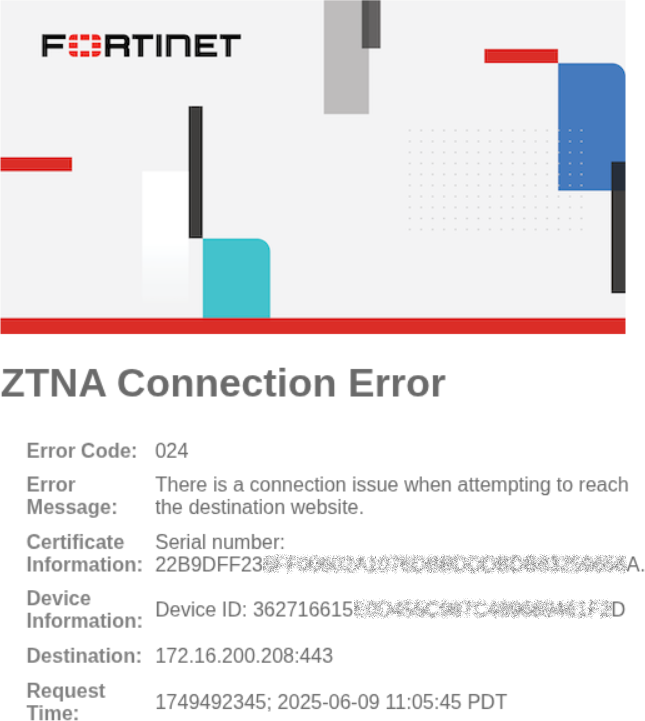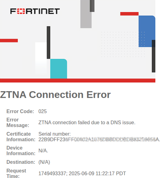 When the endpoint client requests the TCP forwarding resource that matches the wildcard domain, but this address cannot be resolved by the FortiGate, a ZTNA Connection Error replacement message with Error Code 025 is displayed: