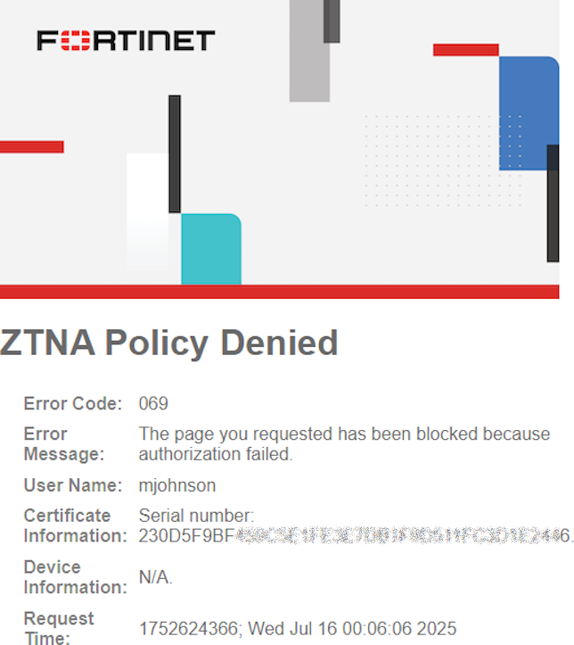 For example, the following replacement message and log show that a user named mjohnson attempted to match a policy on the FortiGate against the ZTNA-webserver access proxy but was unable to match a policy that authorized its access due to no user group matched.