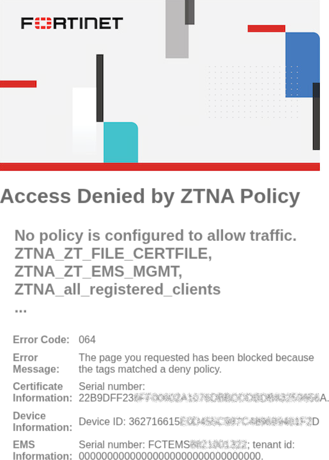 A FortiGate is configured with one or more deny policies, without any allow policies for ZTNA traffic. Client matches one of more of the deny policies based on its tags. An Access Denied by ZTNA policy replacement message with Error Code 064 is displayed: