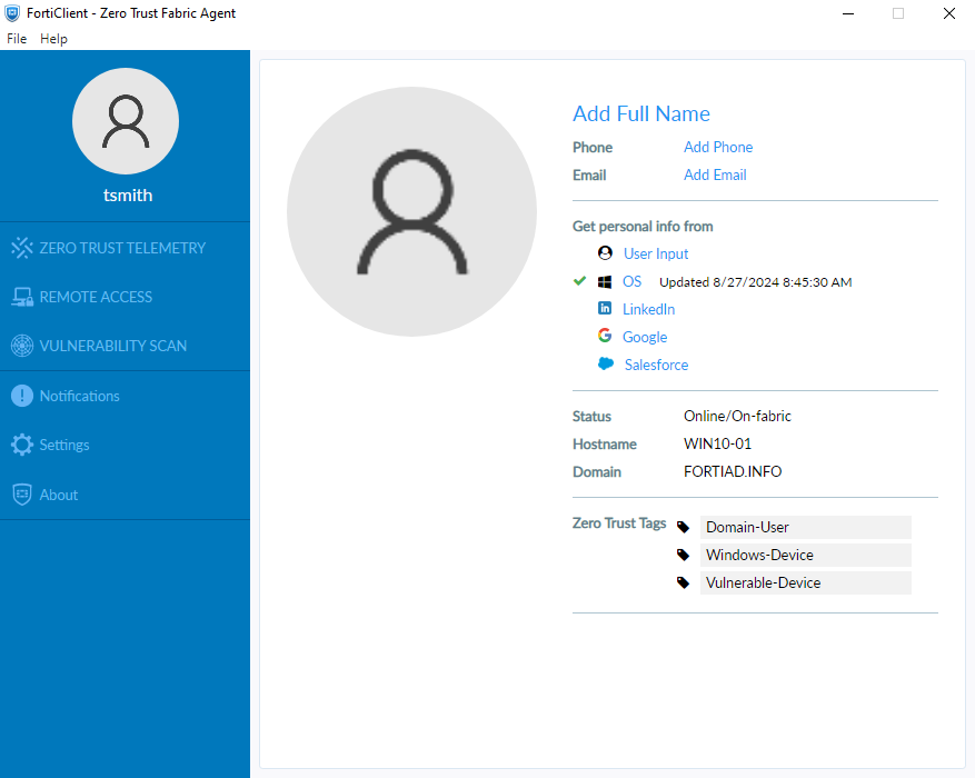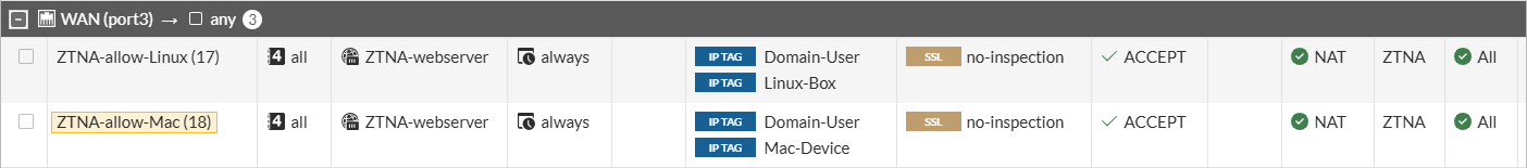 One or more allow ZTNA policies are configured, with negated tag(s) that are required for each policy. For example, the negated Vulnerable-Device, Mac-Device, and Linux-box tags are applied to a ZTNA policy: