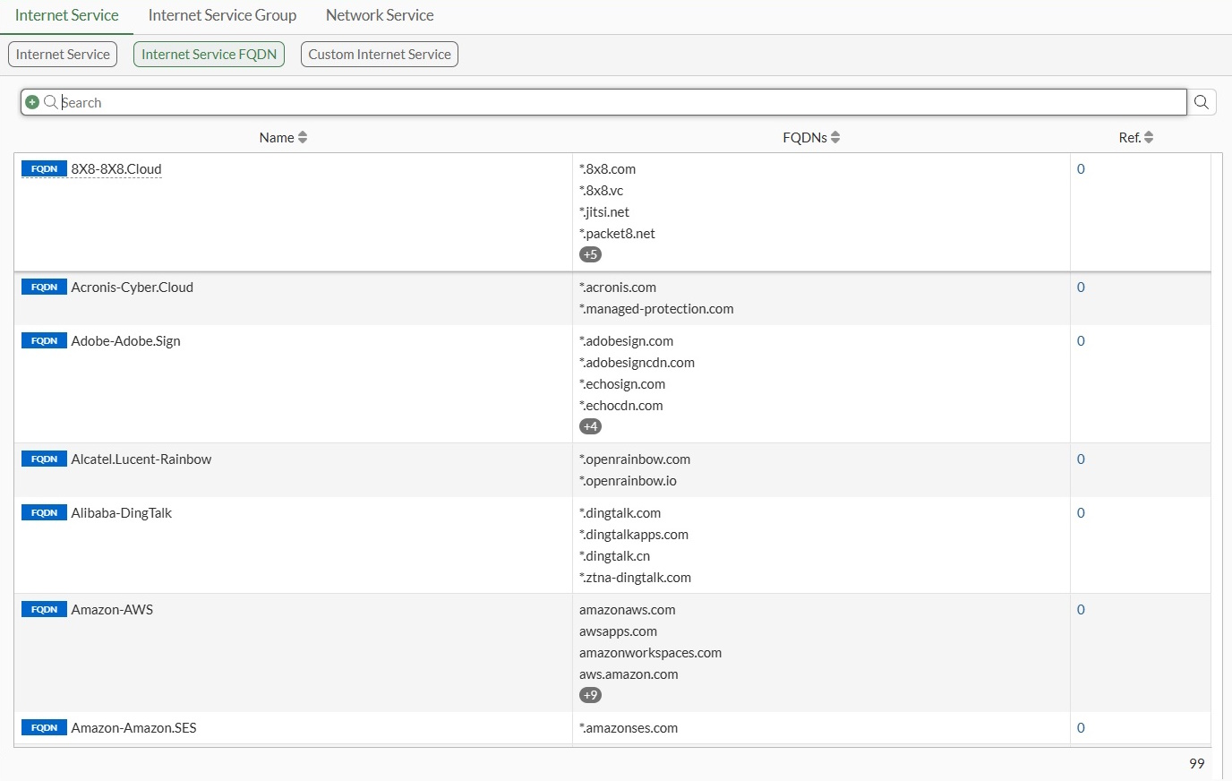 ISDB Fully Qualified Domain Name (FQDN) groups are groups of well-known services like Amazon-AWS, Cisco-Webex, Google-Gmail, Microsoft-Update, and others that are comprised of various FDQNs that make up the service.