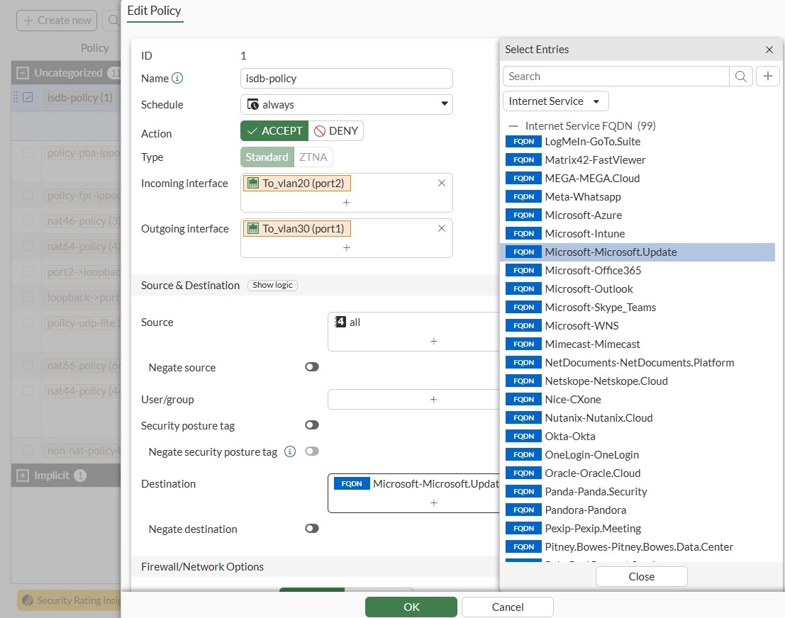 Apply the built-in FQDN entry to the firewall policy: