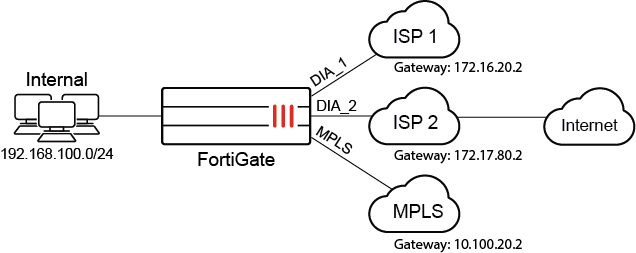 In this example, the SD-WAN has three members: two ISPs (DIA_1 and DIA_2) that are used for access to internet applications, and an MPLS link that is used exclusively as a backup for business critical applications.