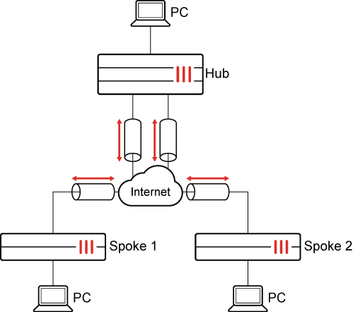 This example shows the configuration of a hub with two spokes.
