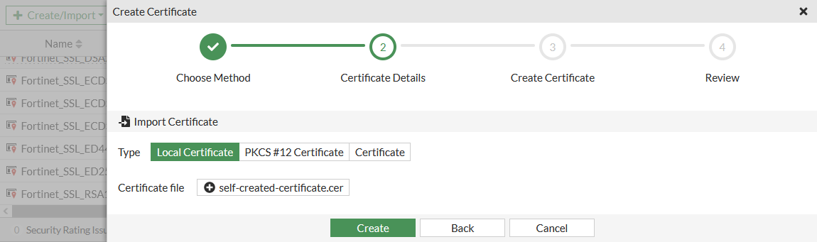 This option allows you to upload a single file and no key. Use it when you have created a CSR on the FortiGate (Generate a CSR), as the key is generated as part of the CSR process and remains on the FortiGate. You must upload a .CER file.