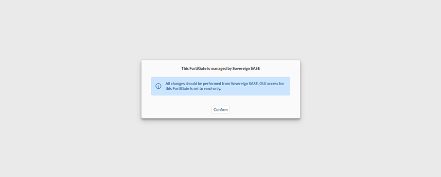With the FortiSASE-Sovereign license installed and activated, go to the FortiSASE-Sovereign portal to complete the onboarding process. See Log on to FortiSASE-Sovereign for more information. Completion of the FortiSASE-Sovereign onboarding process enables sovereign SASE in FortiOS and further restricts the FortiOS GUI and CLI: