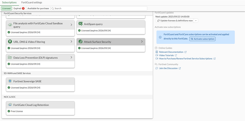 Verify the license is activated by going to System > FortiGuard to see the Fortinet Sovereign SASE license status.