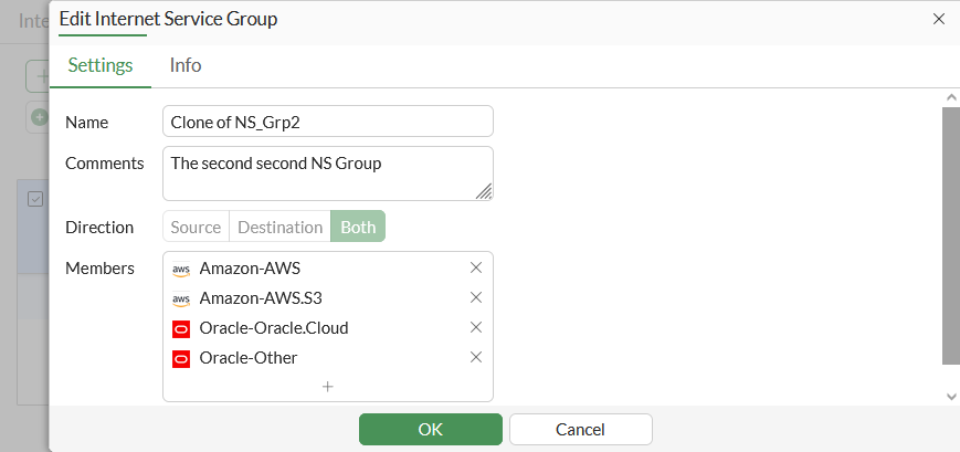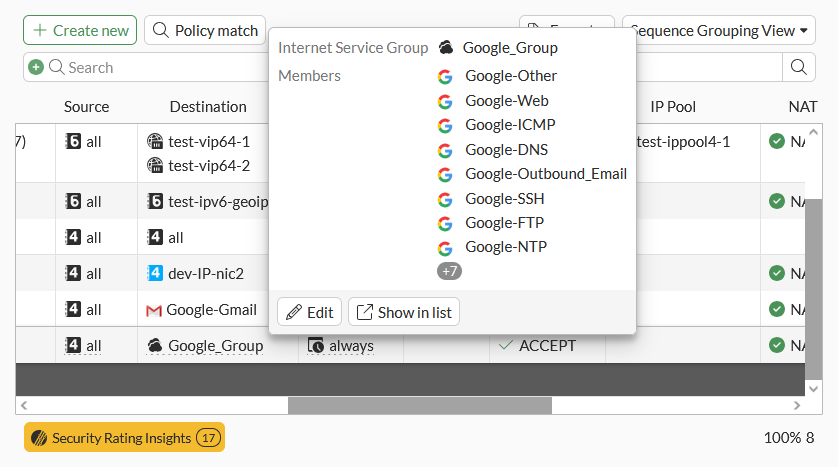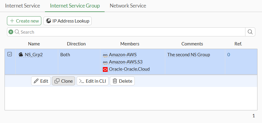 Select Internet Service, and select one or more internet service groups, such as NS_Grp2.
