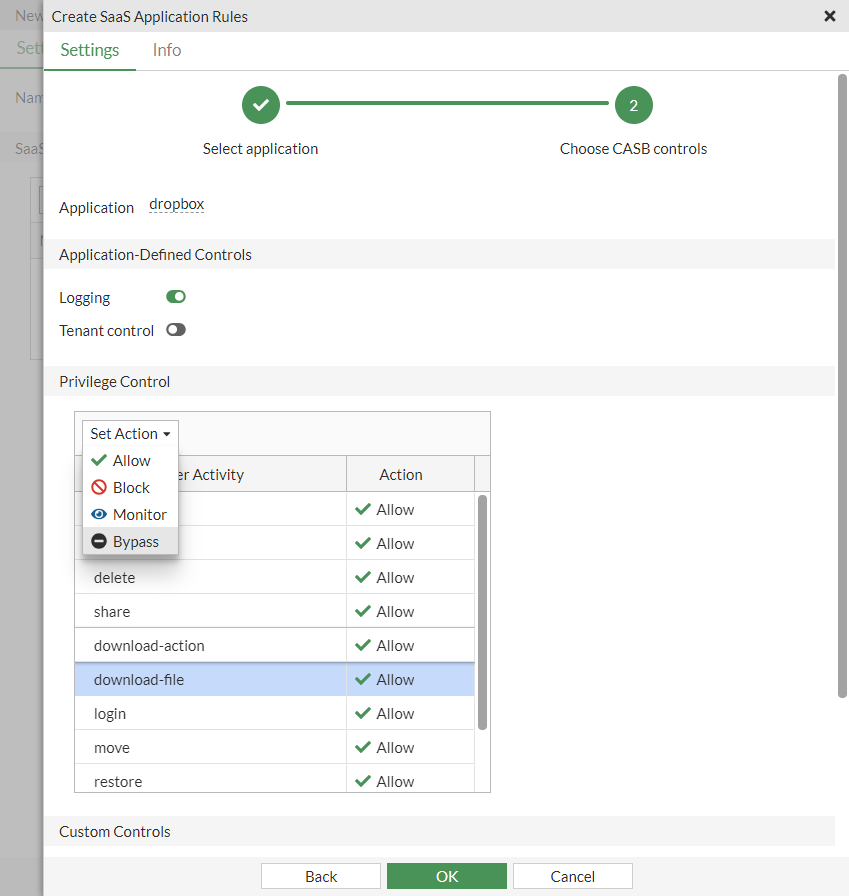 config casb profile edit "dropbox_test" config saas-application edit "dropbox" config access-rule edit "dropbox-download-file" set bypass file-filter set action bypass next end next end next end -