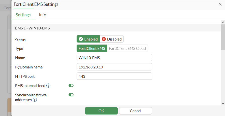 config endpoint-control fctems edit 1 set status enable set name "WIN10-EMS" set server "192.168.20.10" set https-port 443 set pull-sysinfo enable set pull-vulnerabilities enable set pull-tags enable set pull-malware-hash enable set capabilities fabric-auth silent-approval websocket next end -