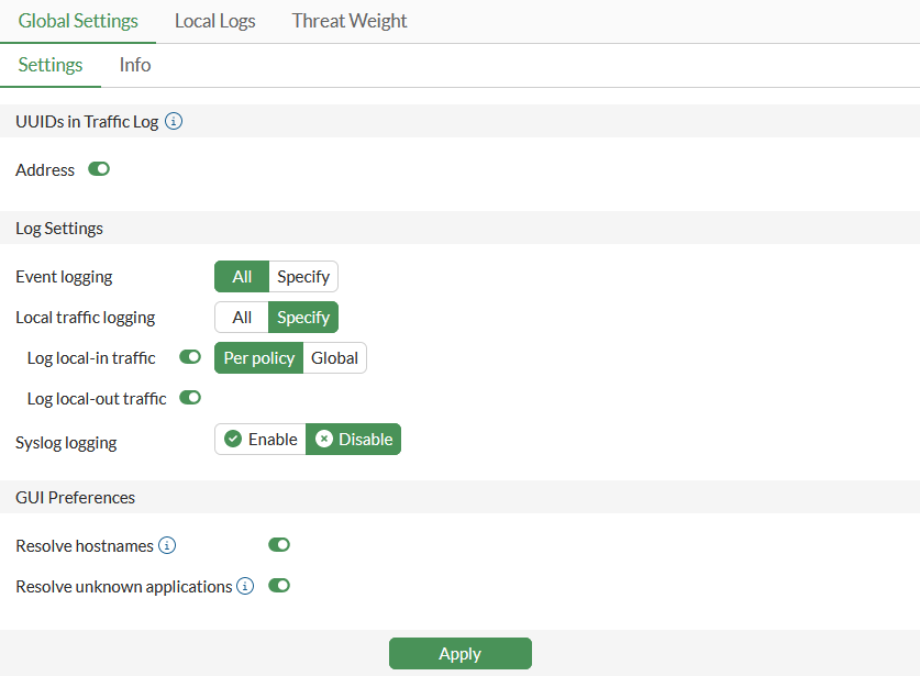 Local-in traffic can also continue to be logged globally instead of per policy. To configure global local-in traffic logging in the CLI, disable local-in-policy-log.