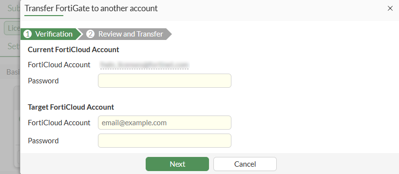 Enter the target FortiCloud Account name and Password, then click Next.
