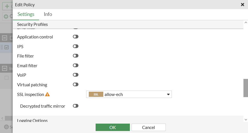 Blocking/allowing ECH is only configurable in an SSL/SSH inspection profile with Inspection method set to SSL Certificate Inspection. |